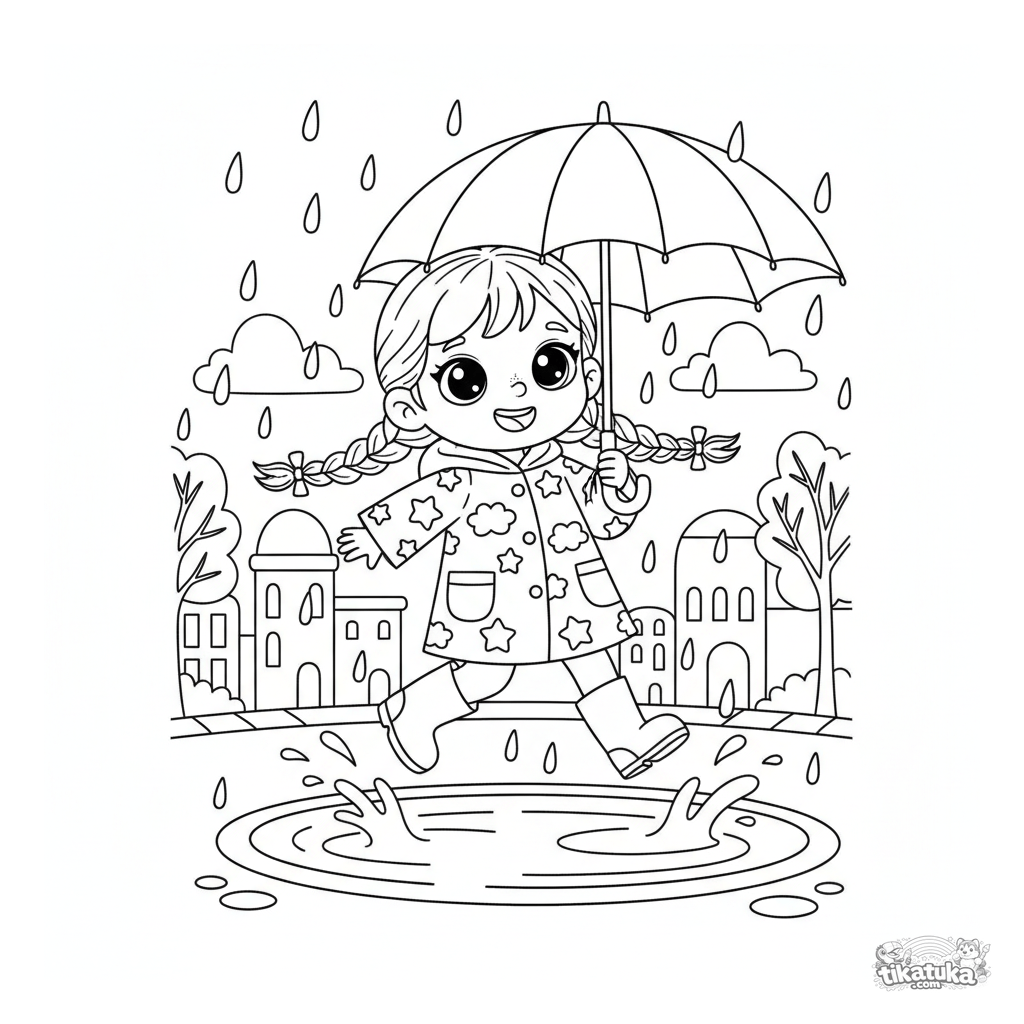 Página para colorir de uma menina feliz de capa de chuva pulando em uma poça debaixo de um guarda-chuva em um dia chuvoso. Para crianças de 4 a 6 anos.