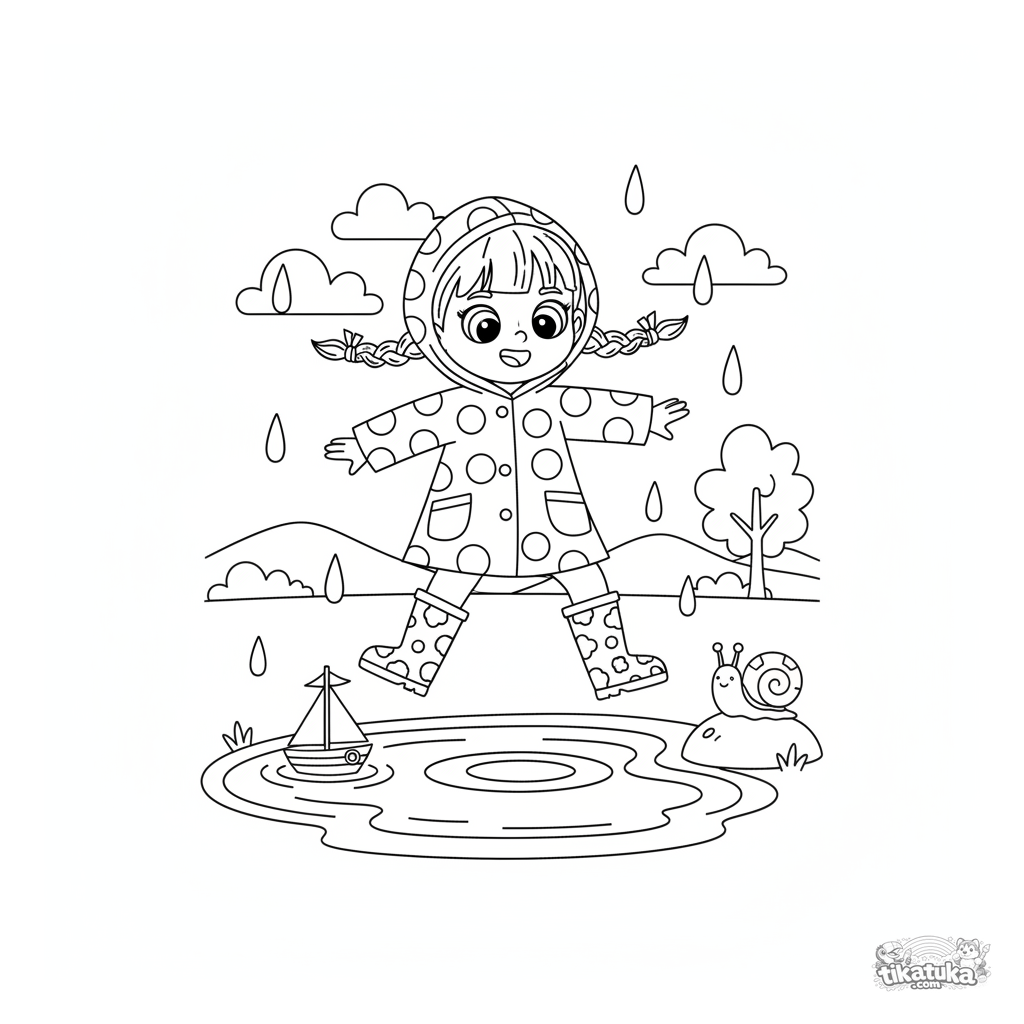 Página para colorir de uma menina de capa de chuva pulando em poças de primavera. Para crianças de 3 a 6 anos.