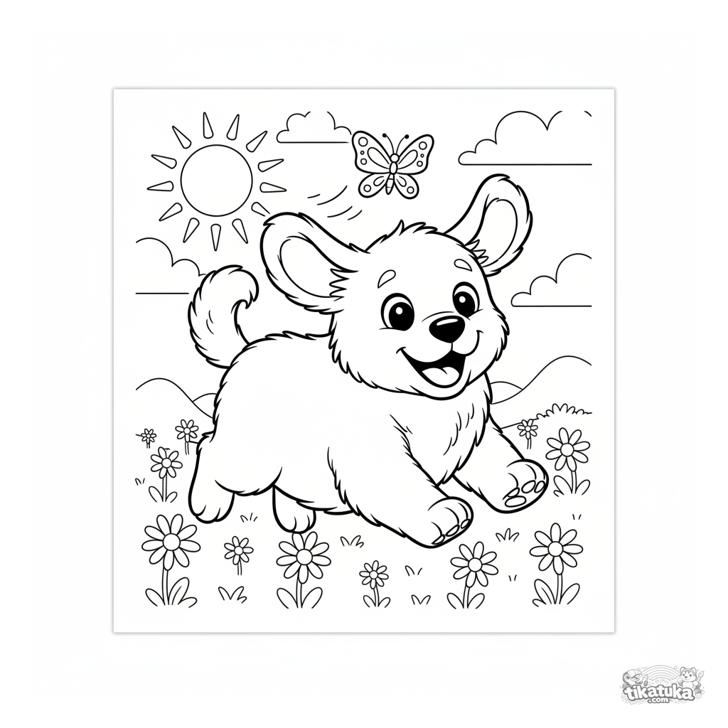 Página para colorir para crianças de 4-6 anos: um filhote de golden retriever curioso persegue feliz uma borboleta em um prado ensolarado. Formas simples e expressão facial fofa.