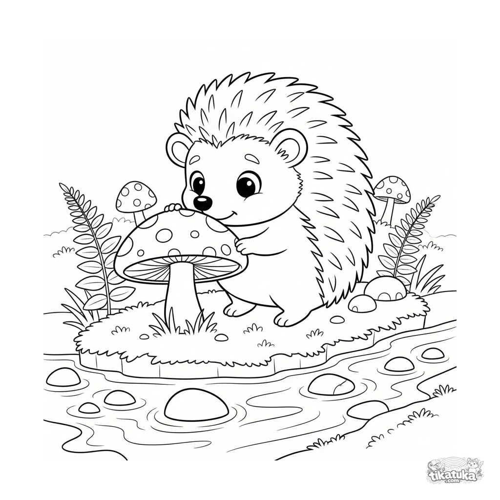 Página para colorir para crianças 4-6: um ouriço curioso na margem de um riacho claro investiga um cogumelo grande. Uma cena fofa da natureza do outono com samambaias e seixos.