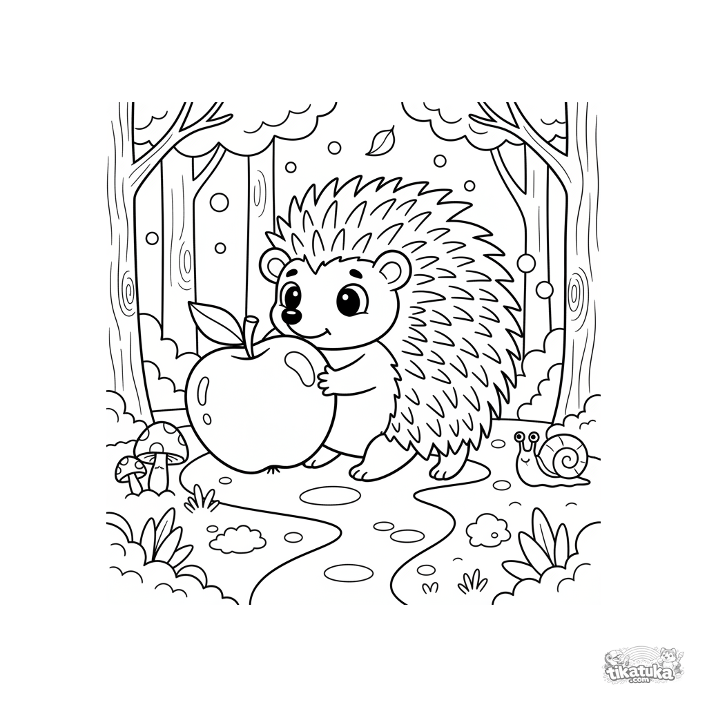 Página para colorir para crianças de 4-6 anos: um ouriço curioso empurra uma maçã por uma trilha na floresta. Formas simples e uma cena fofa.