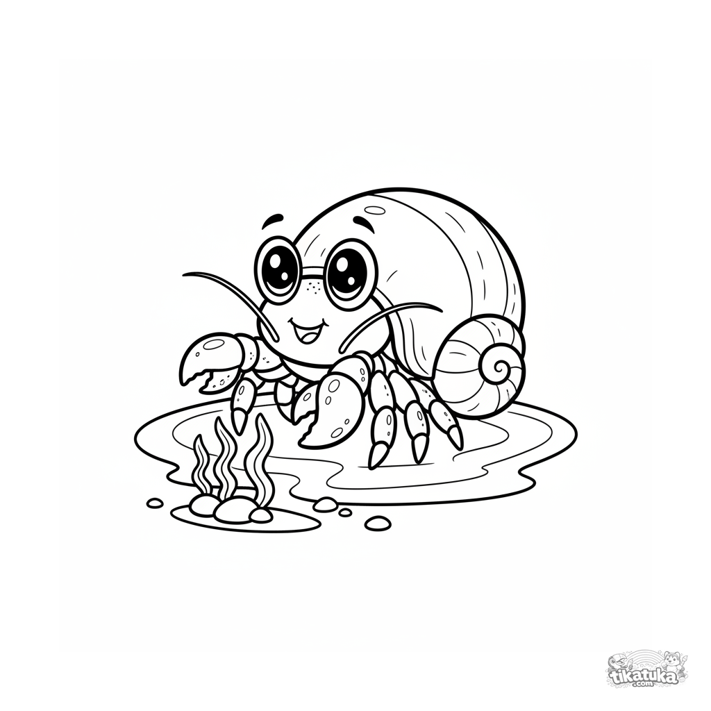 Página para colorir de um fofo caranguejo-eremita espiando de sua concha em uma poça de maré ensolarada no raso.