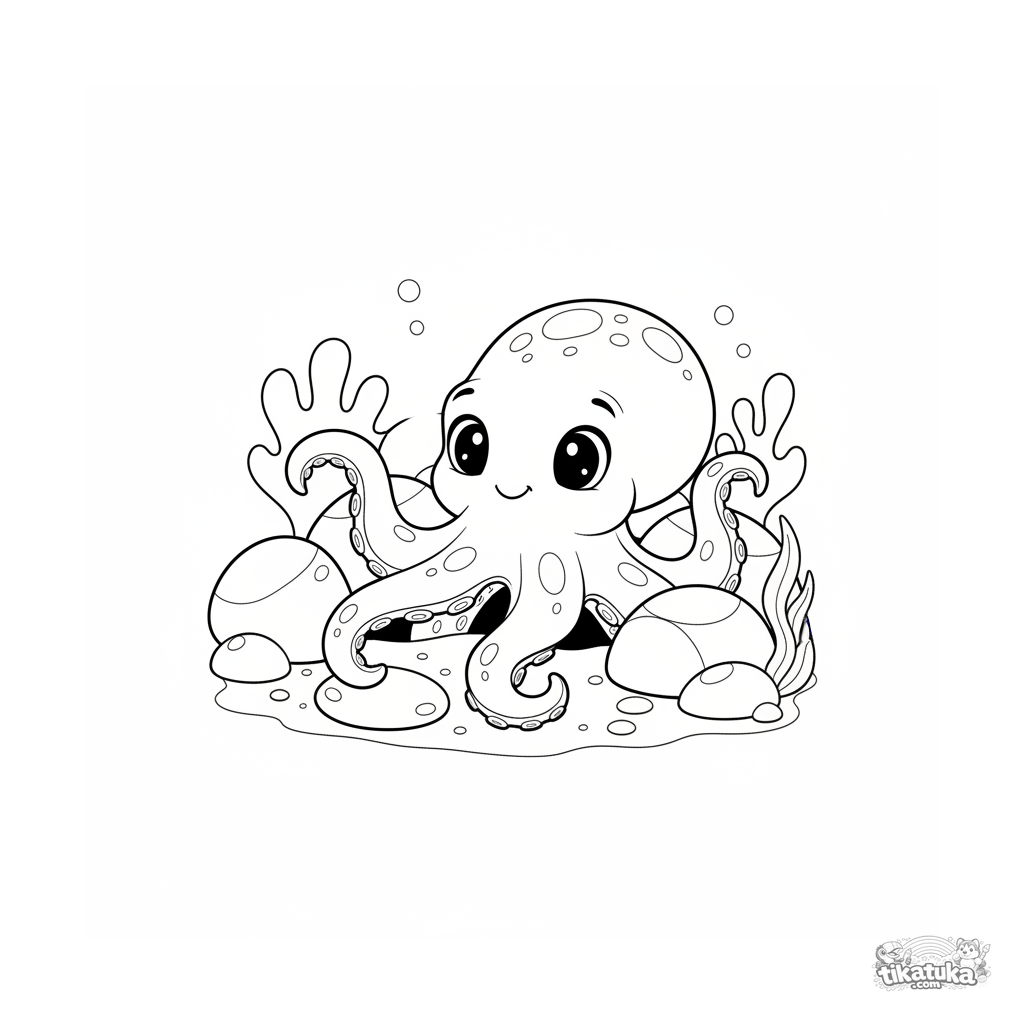 Página para colorir de um polvo curioso espiando entre pedras no raso ensolarado. Para 7-9 anos. Estilo suave de ilustração de livro.