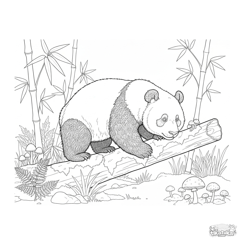 Página para colorir de um panda-vermelho curioso para crianças de 6 a 9 anos. Equilibra-se num tronco com musgo numa floresta de bambu, farejando cogumelos.