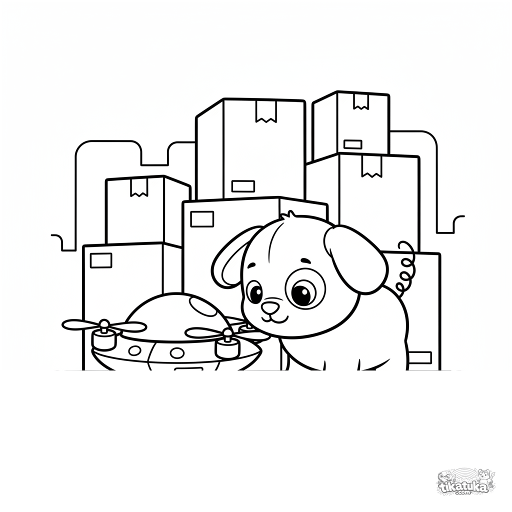 Página para colorir para crianças pequenas 2-3: um robô filhote fofo com cauda abanando investiga um drone entre pilhas de caixas em um armazém. Formas grandes simples, margens largas.