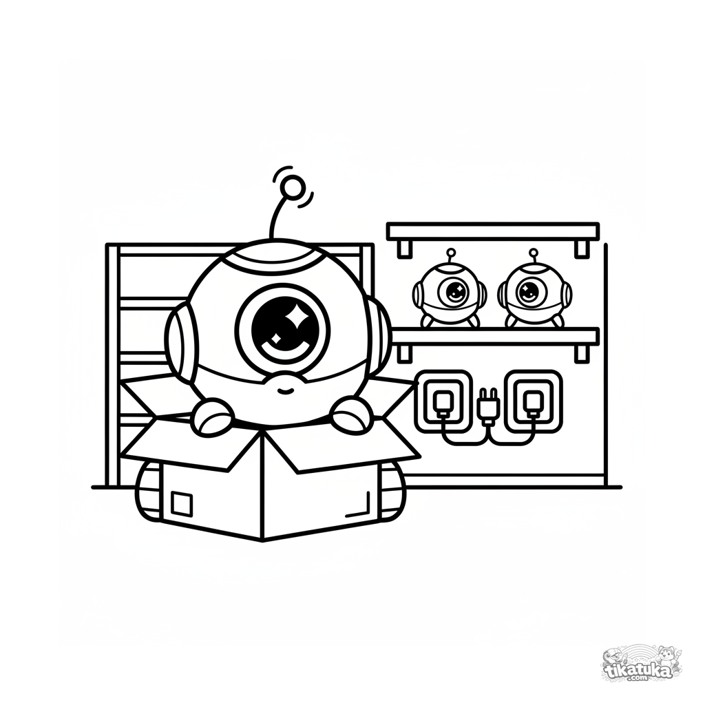 Página para colorir simples para crianças pequenas de 2-3 anos: um robô esférico curioso espreita de trás de uma caixa. Formas grandes, muito poucos detalhes, áreas enormes para colorir.
