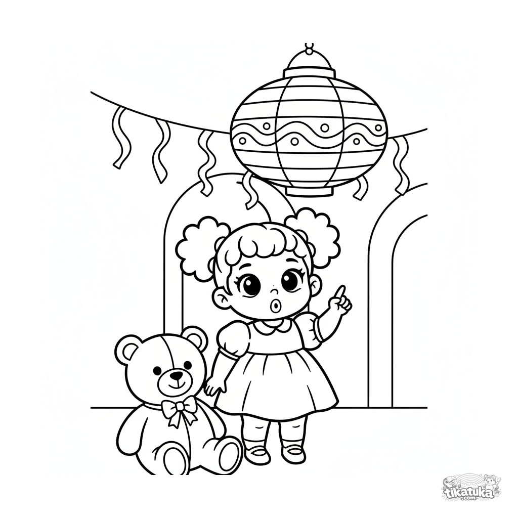 Página para colorir simples para crianças pequenas 2-3: uma menininha em um salão festivo aponta com curiosidade para uma lanterna de papel pendurada. Formas grandes e claras.