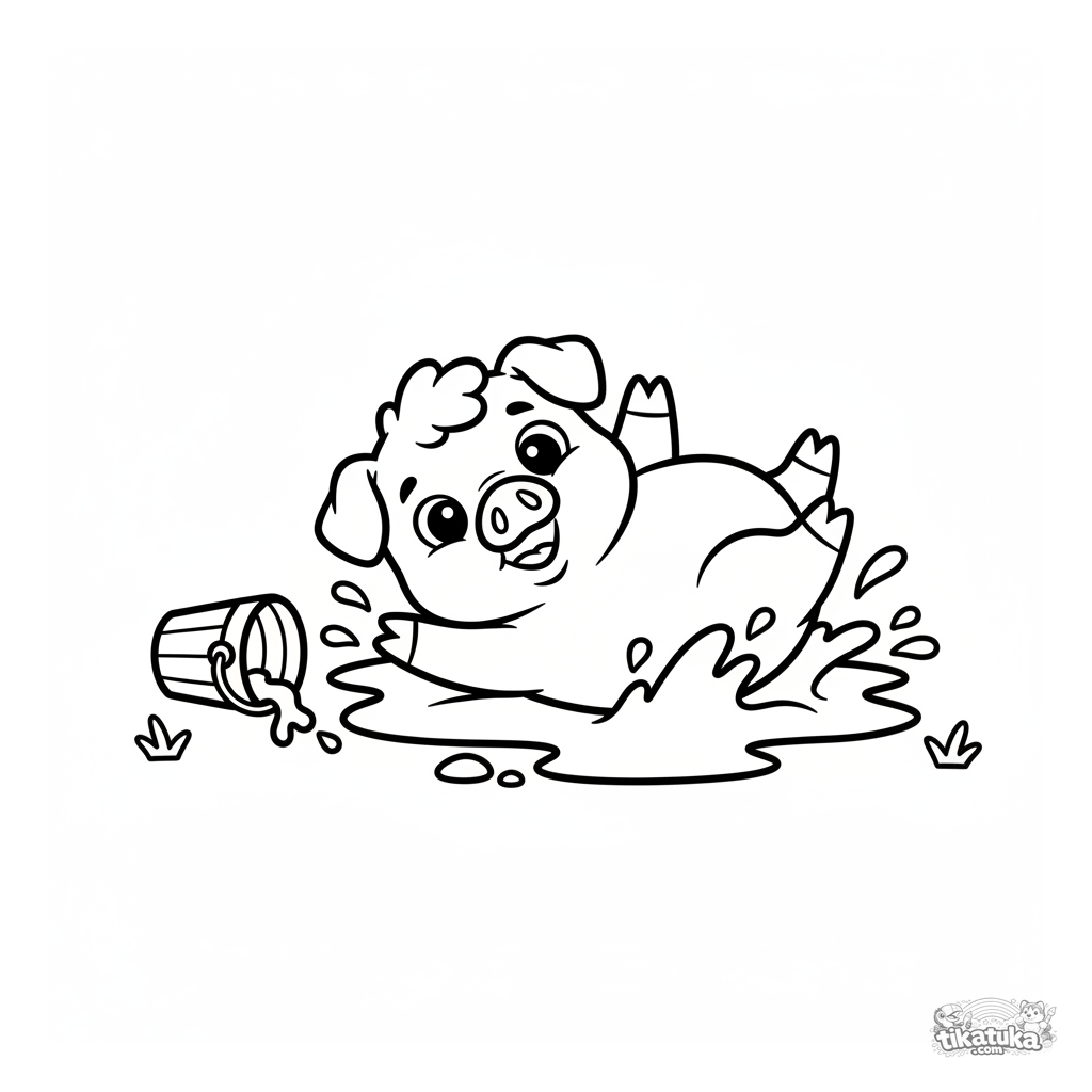 Página para colorir para crianças pequenas: um leitão de cabelo cacheado rola feliz em uma poça de lama em uma fazenda. Formas grandes e simples com amplas margens brancas.