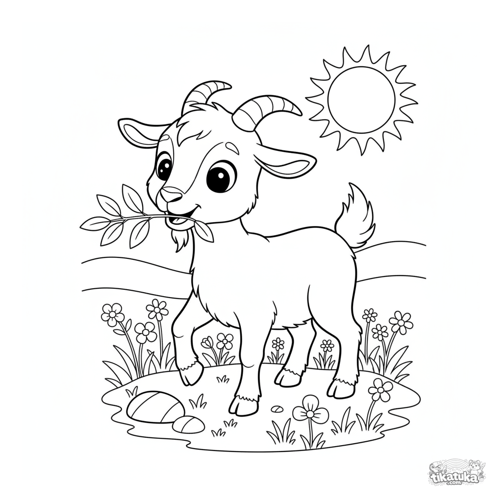 Página para colorir para crianças de 4 a 6 anos. Um cabritinho brincalhão com chifres encaracolados mordiscando um galho em um campo ensolarado.