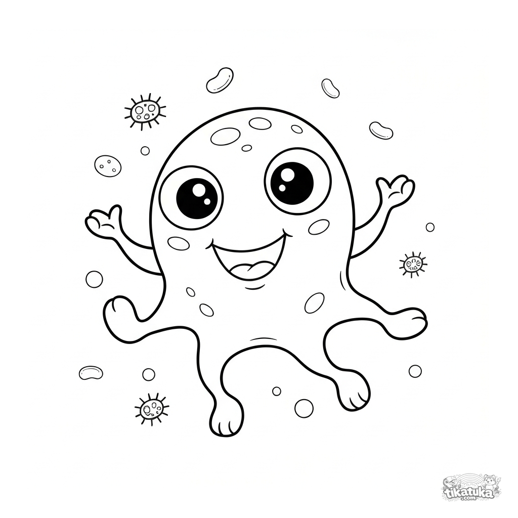 Uma página para colorir de Micróbios com nível Fácil. Ela combina com a idade 2-5 anos, imprime bem em casa e abre imediatamente no modo online.