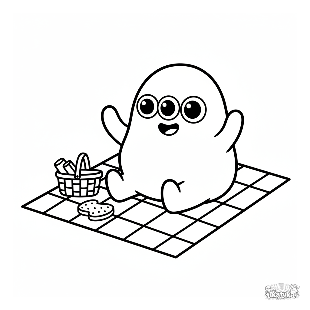 Página divertida para colorir de um micróbio ameba amigável fazendo um piquenique. Para crianças pequenas de 2 a 5 anos.
