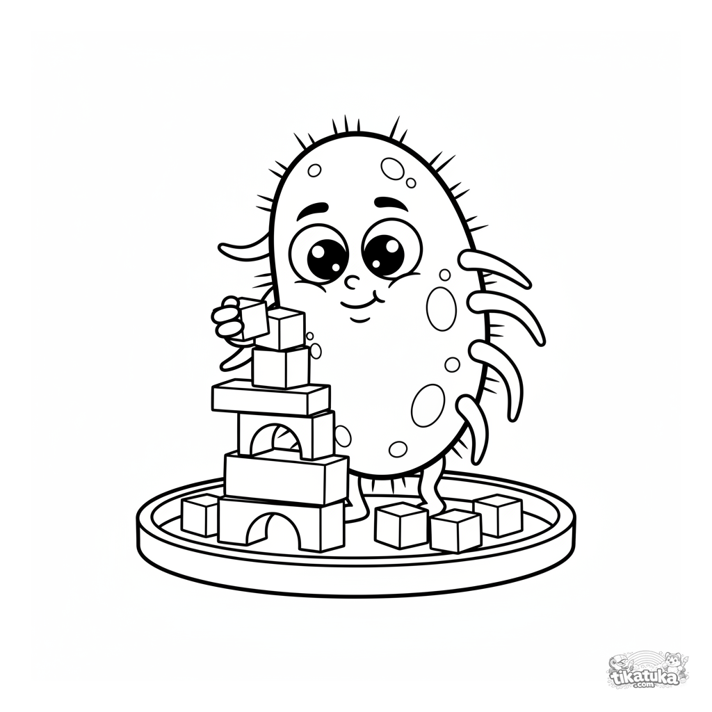 Página para colorir simples para crianças pequenas de 2 a 3 anos. Um micróbio amigável com olhos grandes constrói uma torre de blocos em uma placa de Petri. Formas grandes, poucos detalhes.
