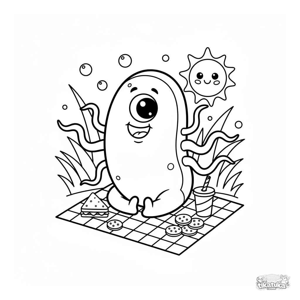 Página para colorir para crianças de 4-6 anos: uma bactéria engraçada com flagelos faz um piquenique. Uma cena de desenho animado, fofa e educativa.