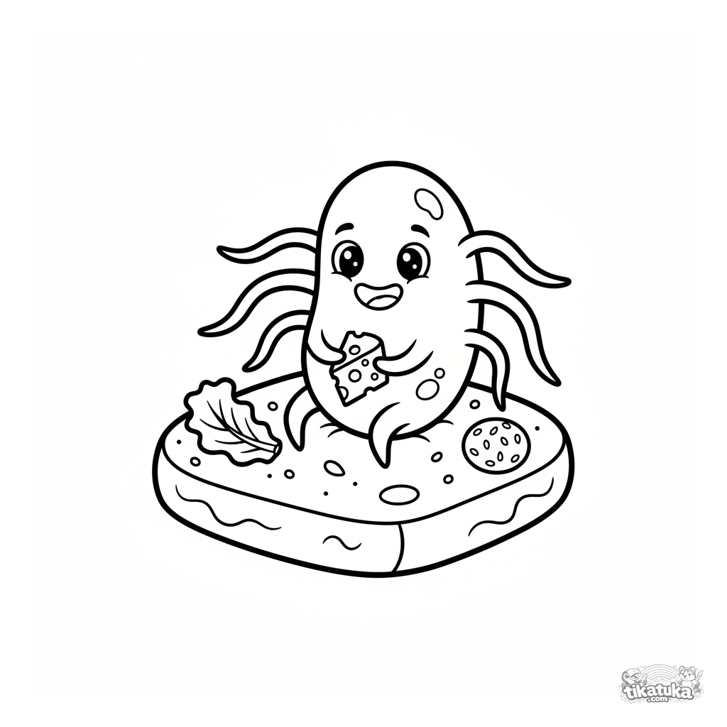 Página para colorir para crianças pequenas 2-3: uma bactéria amigável com flagelos fazendo piquenique numa migalha de pão. Formas muito simples e grandes, poucas linhas.