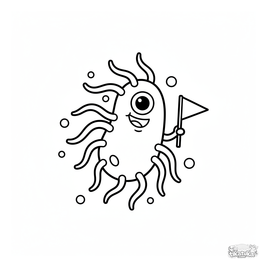 Página para colorir fácil para crianças de 2-5 anos: uma bactéria feliz com flagelos segurando uma bandeirinha. Imagem fofa e simples.