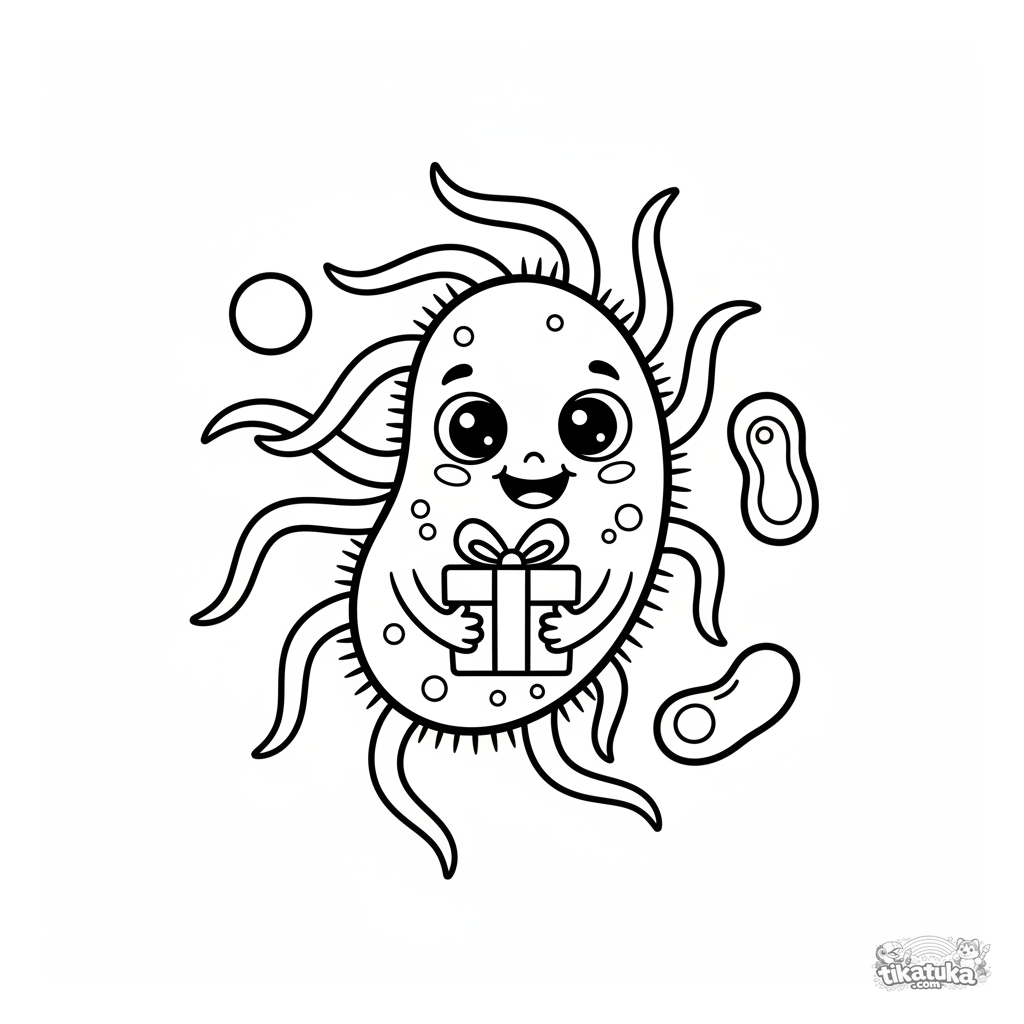 Uma bactéria fofa de desenho animado com flagelos está segurando um pequeno presente. Página simples para colorir para crianças pequenas de 2 a 5 anos.