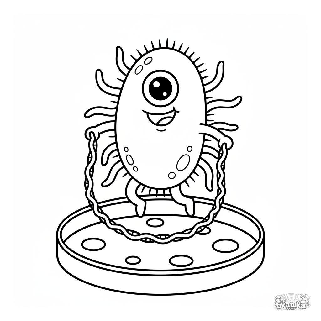 Página para colorir para crianças pequenas 2-3: uma bactéria fofa e amigável com flagelos brinca de pular corda com uma fita de DNA em uma placa de petri. Formas muito simples.