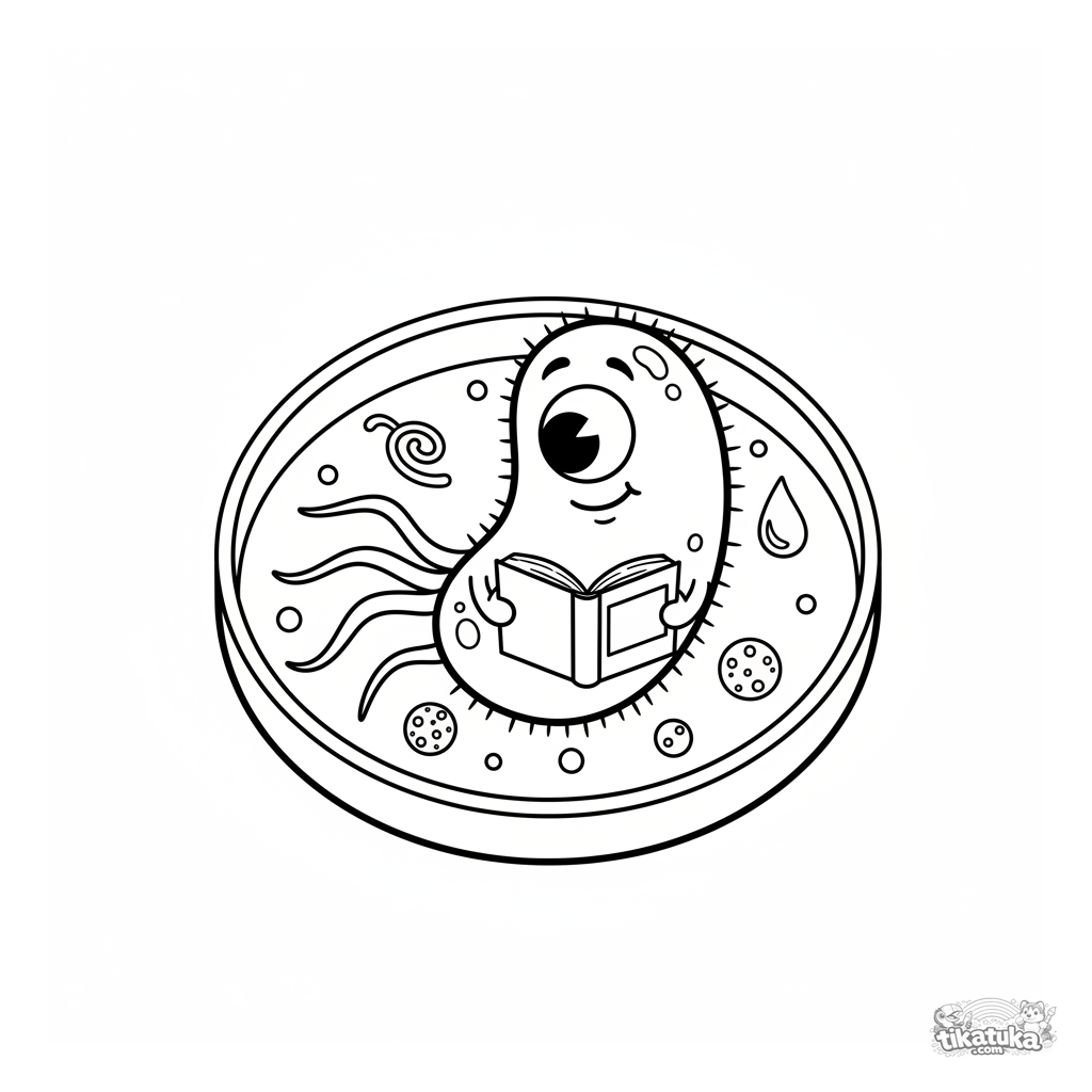 Página para colorir divertida: uma bactéria fofa lê um livro em uma placa de Petri. Para crianças de 5 a 8 anos. Inclui plasmídeos e vírus.