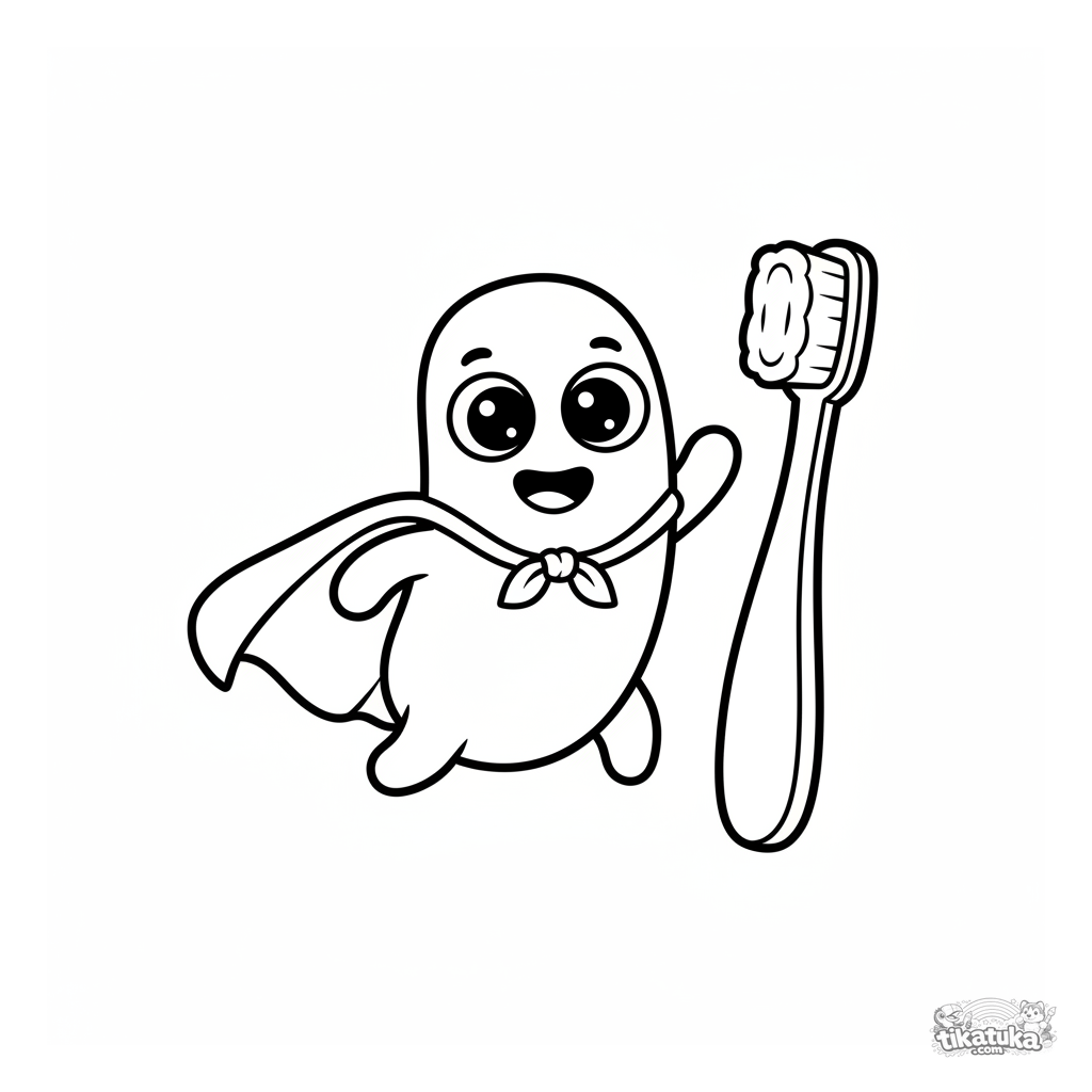 Página simples para colorir para crianças pequenas 2-3 anos: uma bactéria amigável com capa flutua perto de uma escova de dentes. Formas grandes.