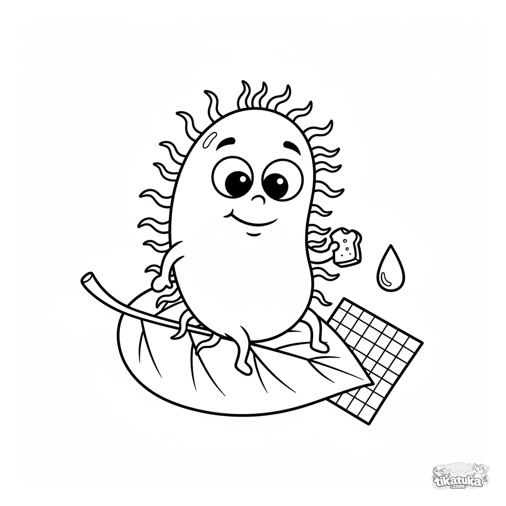 Página engraçada para colorir de uma bactéria amigável fazendo um piquenique em uma folha. Para crianças pequenas de 2-5 anos.