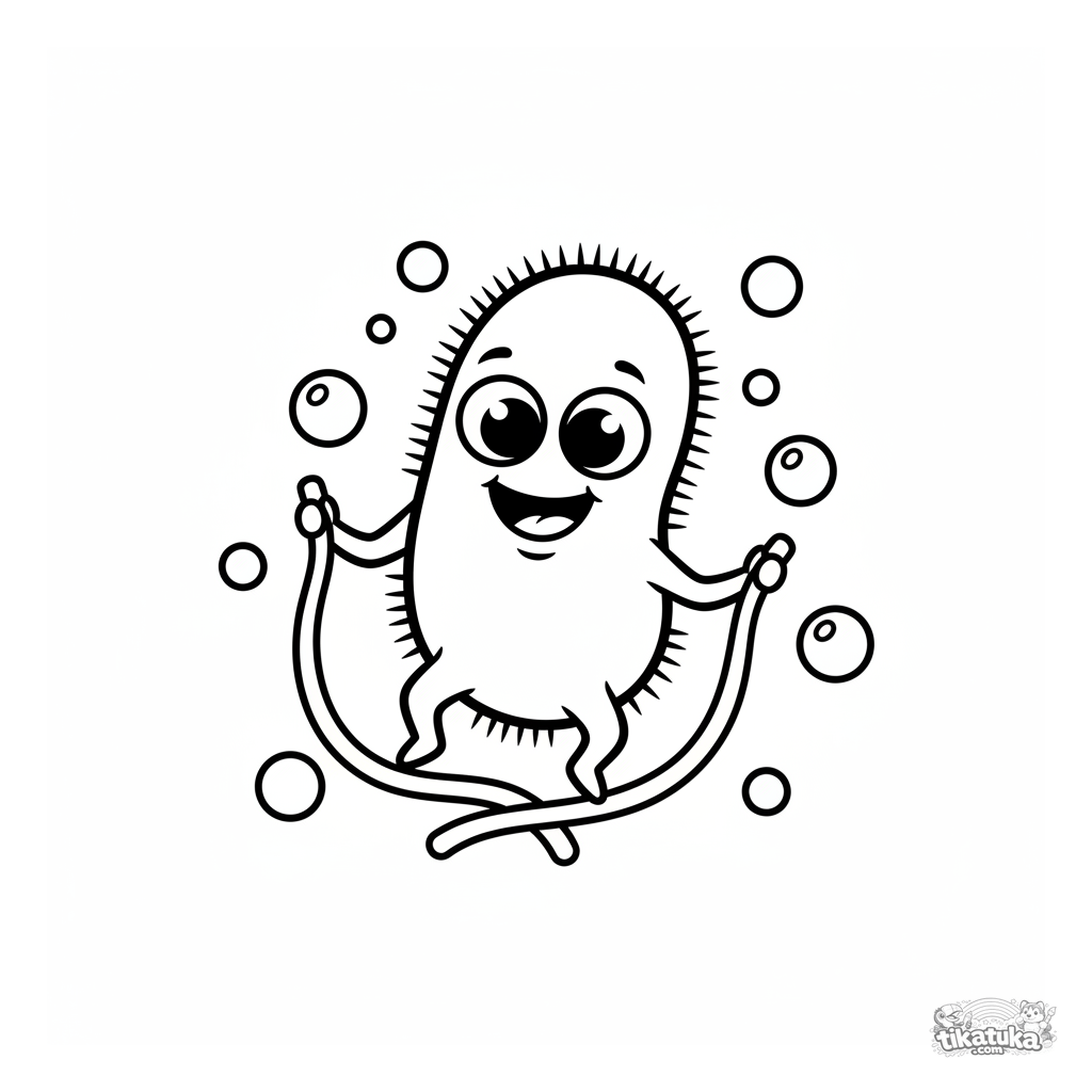 Página para colorir para crianças pequenas: uma bactéria fofa e amigável com olhos esbugalhados brinca de pular corda. Formas e contornos muito simples para 2-3 anos.