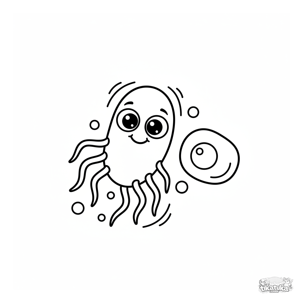 Página para colorir fácil para crianças pequenas 2-3: uma bactéria de desenho animado amigável com olhos grandes e caudas ondulantes nada. Formas simples e grandes.