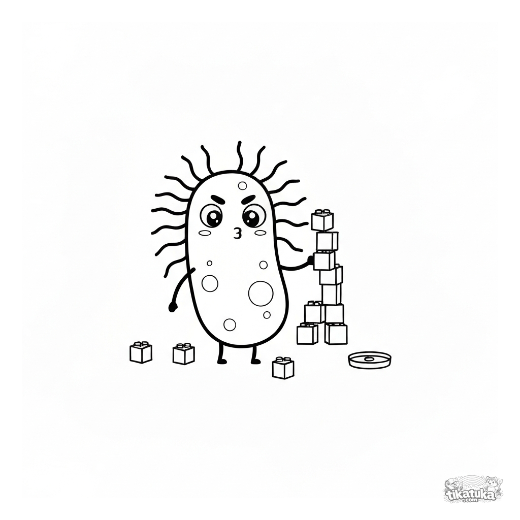 Página para colorir simples de uma bactéria fofa de desenho animado construindo uma torre de blocos. Para crianças pequenas de 2 a 5 anos.