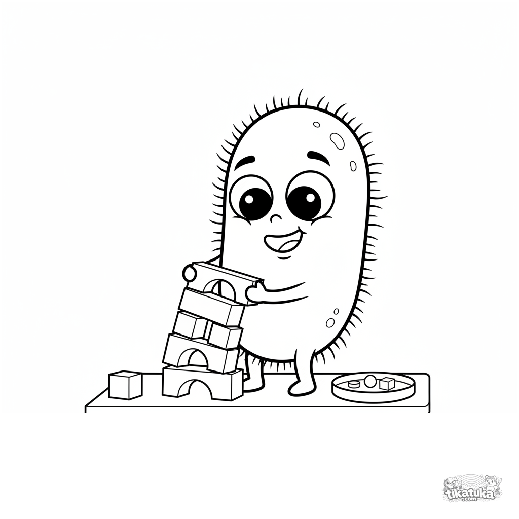 Página simples e engraçada para colorir de uma bactéria amigável construindo uma torre de blocos. Para crianças de 2 a 5 anos. Micróbio com olhos grandes em uma lâmina de laboratório.