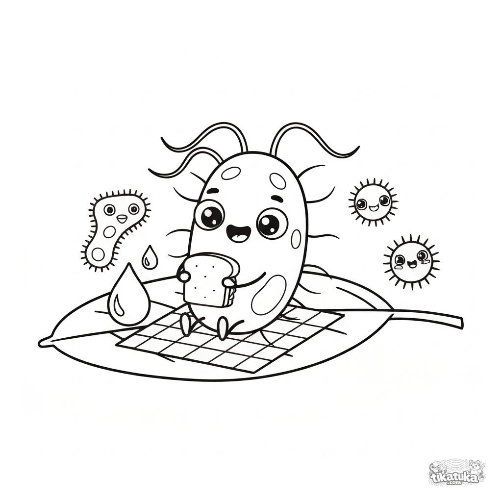 Página simples e engraçada para colorir de uma bactéria amigável fazendo piquenique em uma folha. Para crianças de 2 a 5 anos.