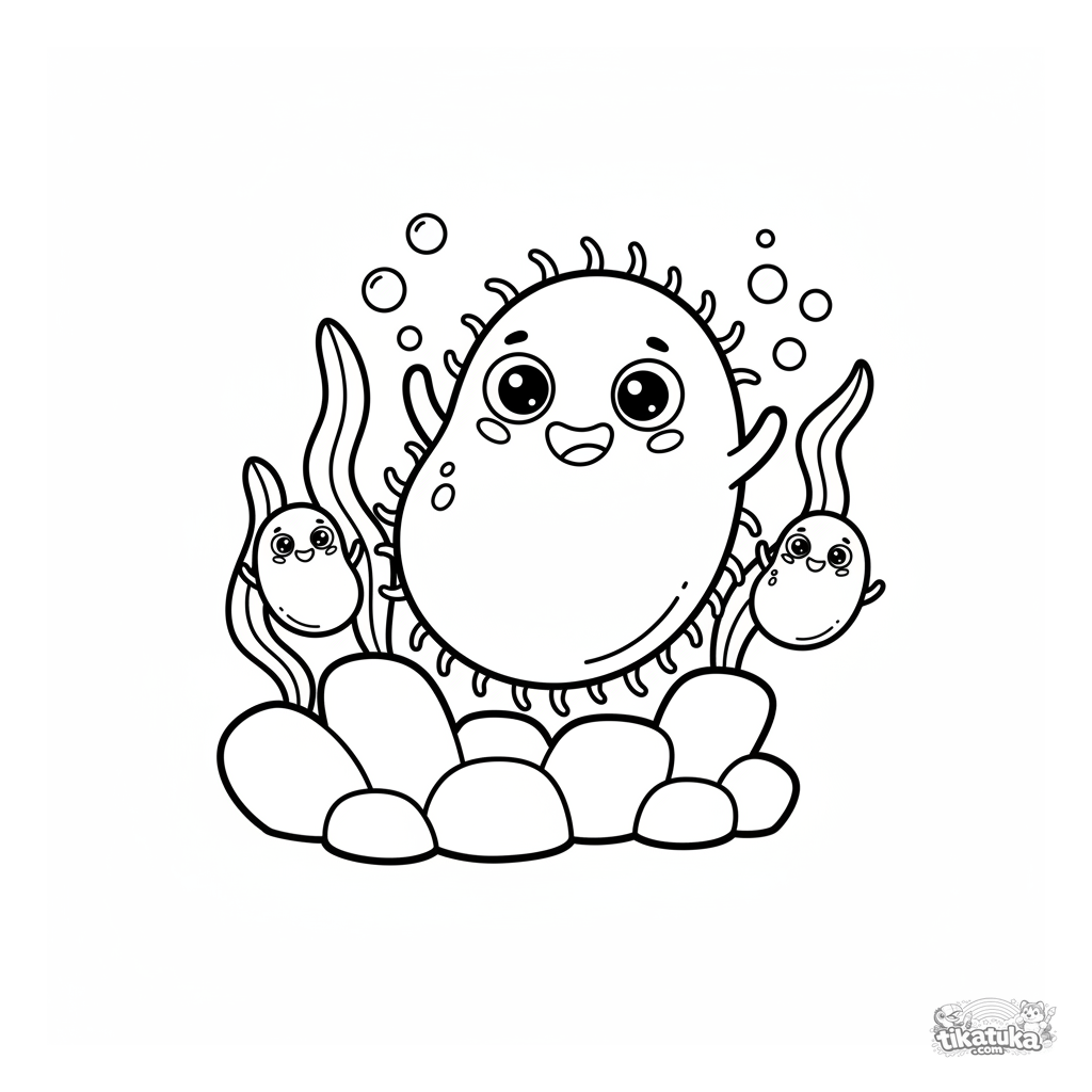 Página simples para colorir de uma bactéria fofa de desenho animado nadando perto de um recife de coral. Para crianças pequenas de 2 a 3 anos.