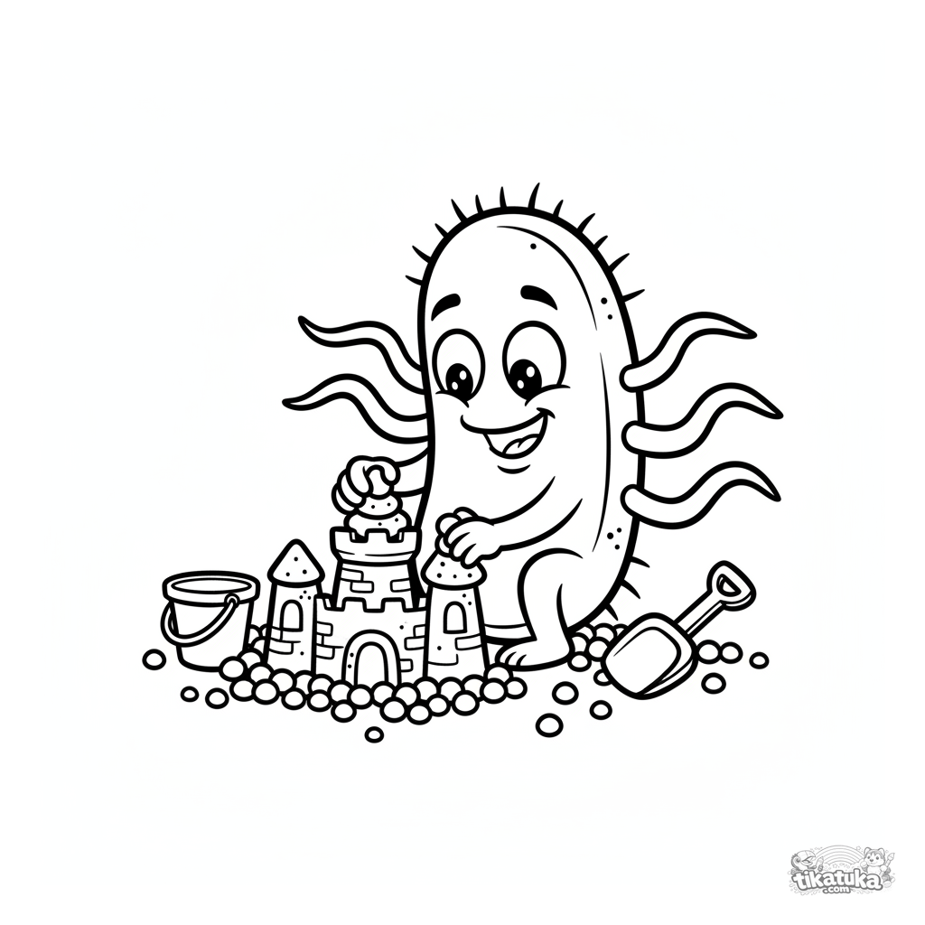 Página para colorir fácil e fofa para crianças de 2 a 5 anos: uma bactéria amigável com múltiplos olhos constrói um minúsculo castelo de areia com balde e pá.