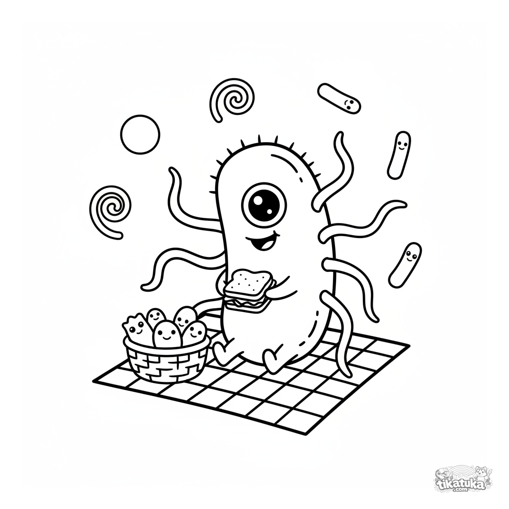 Página divertida para colorir: uma bactéria fofa com flagelos fazendo piquenique em uma membrana celular. Para crianças de 5 a 8 anos. Cena científica única.