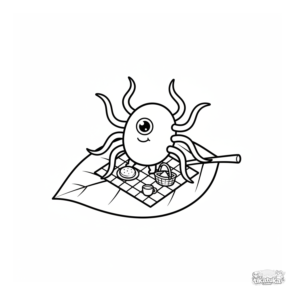 Página para colorir de uma bactéria fofa usando seus flagelos para fazer um piquenique em uma folha. Para crianças de 2-5 anos. Cena microscópica divertida.