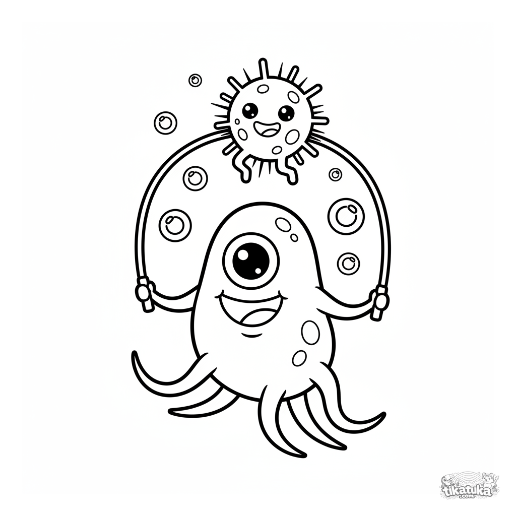 Página para colorir de bactérias de desenho animado brincando alegremente de pular corda. Para os mais pequenos, de 3 a 5 anos.