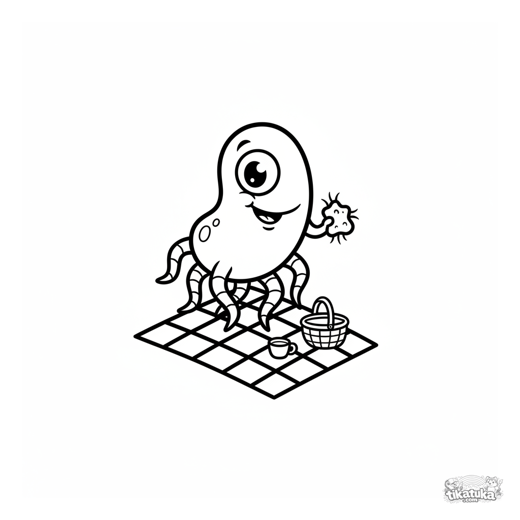 Página engraçada para colorir para crianças pequenas 2-3: uma bactéria amigável com um olho faz um piquenique. Formas enormes e simples, perfeitas.