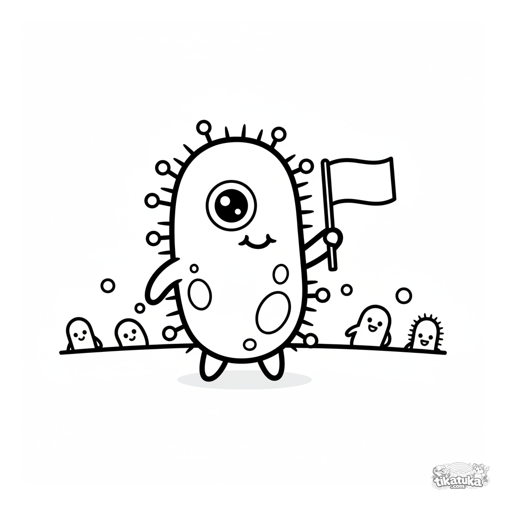 Página para colorir simples de uma bactéria fofa e amigável acenando uma bandeirinha. Para crianças pequenas de 2 a 5 anos.