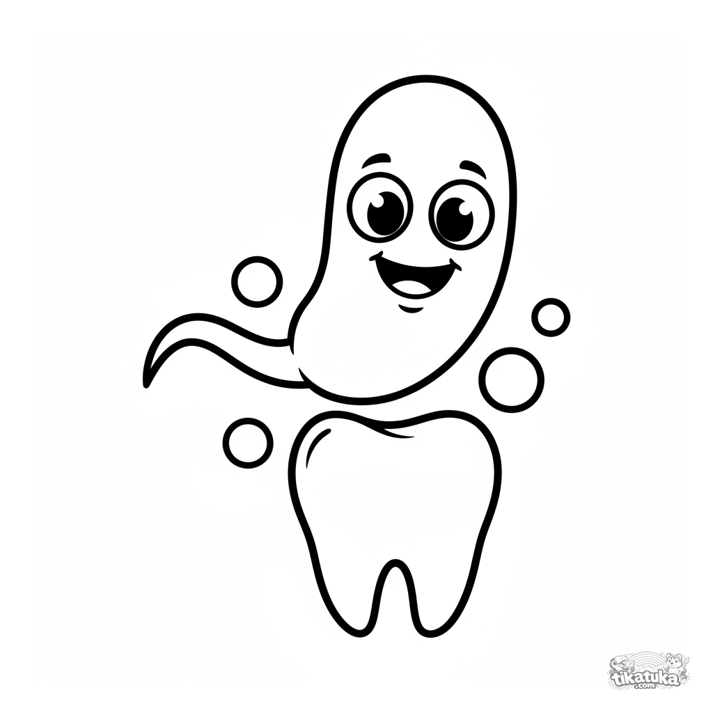Página simples para colorir para crianças pequenas 2-3: uma bactéria de desenho animado feliz com olhos grandes nada perto de um dente.