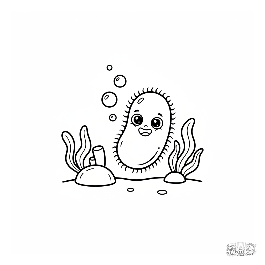 Página para colorir para crianças pequenas 2-3 anos: uma bactéria fofa de desenho animado com olhos grandes nada perto de um recife de coral.
