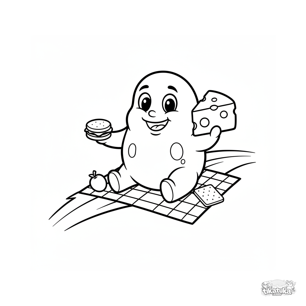 Página simples para colorir para crianças pequenas de 2-3 anos: um micróbio lactobacillus amigável e gordinho faz um piquenique num cobertor na grama, segurando um sanduíche e queijo minúsculos.