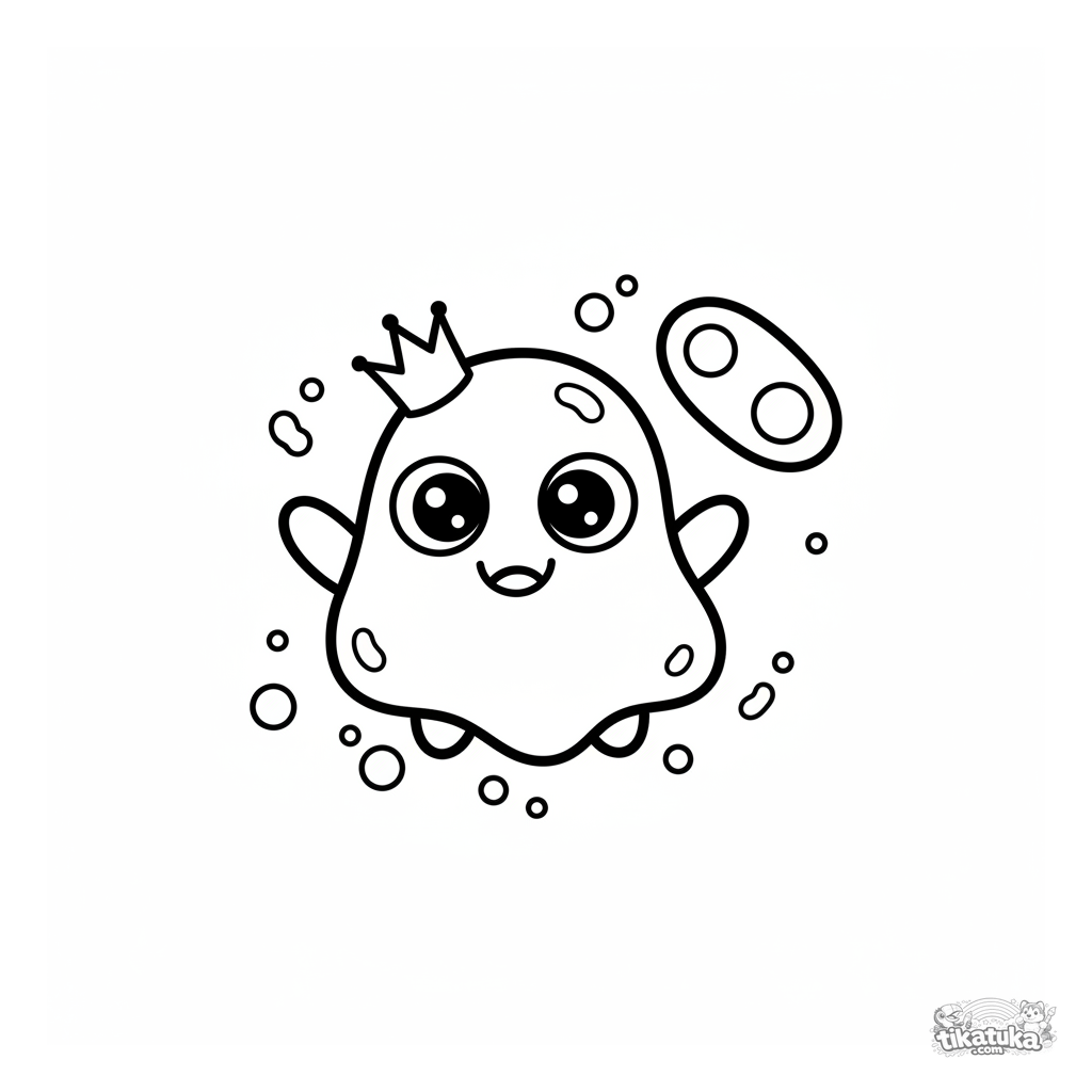 Página para colorir para crianças de 2-3 anos: um micróbio de desenho animado com olhos esbugalhados e coroa flutua perto de uma célula. Formas muito simples, grandes e fechadas.