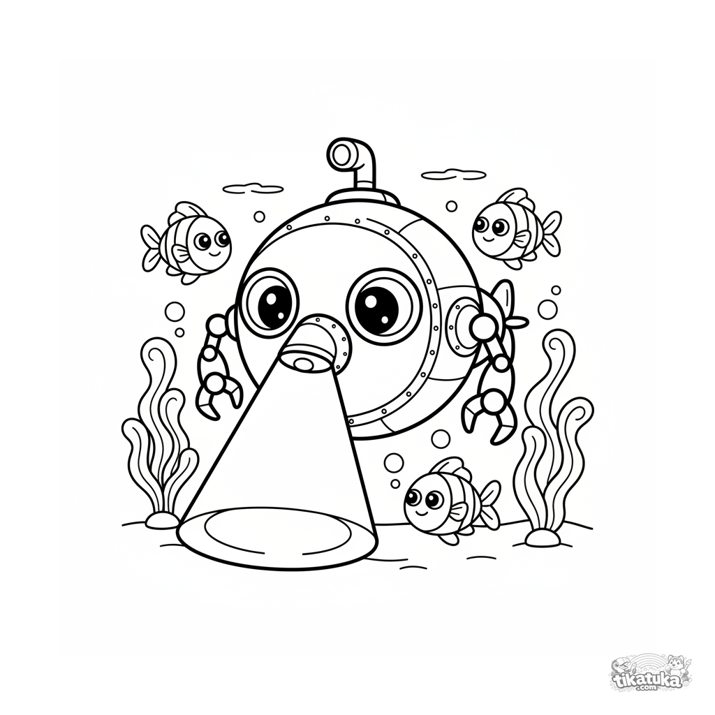 Página muito simples para colorir para crianças pequenas de 2-3 anos: um submarino redondo fofo com olhos de janela explora o mar profundo. Formas grandes.