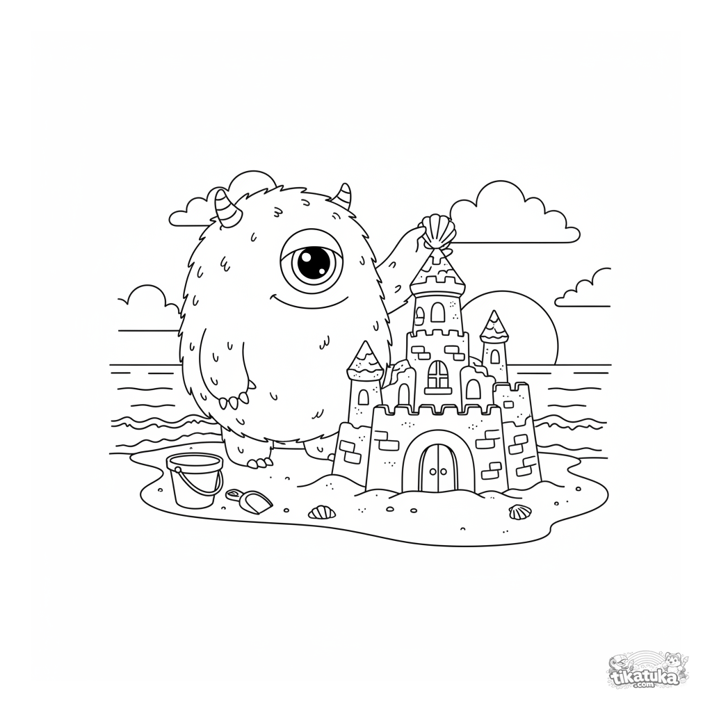 Página para colorir para crianças de 4-6 anos: um monstro peludo e fofo com um olho constrói um castelo de areia na praia ao pôr do sol. Cena com balde e concha.