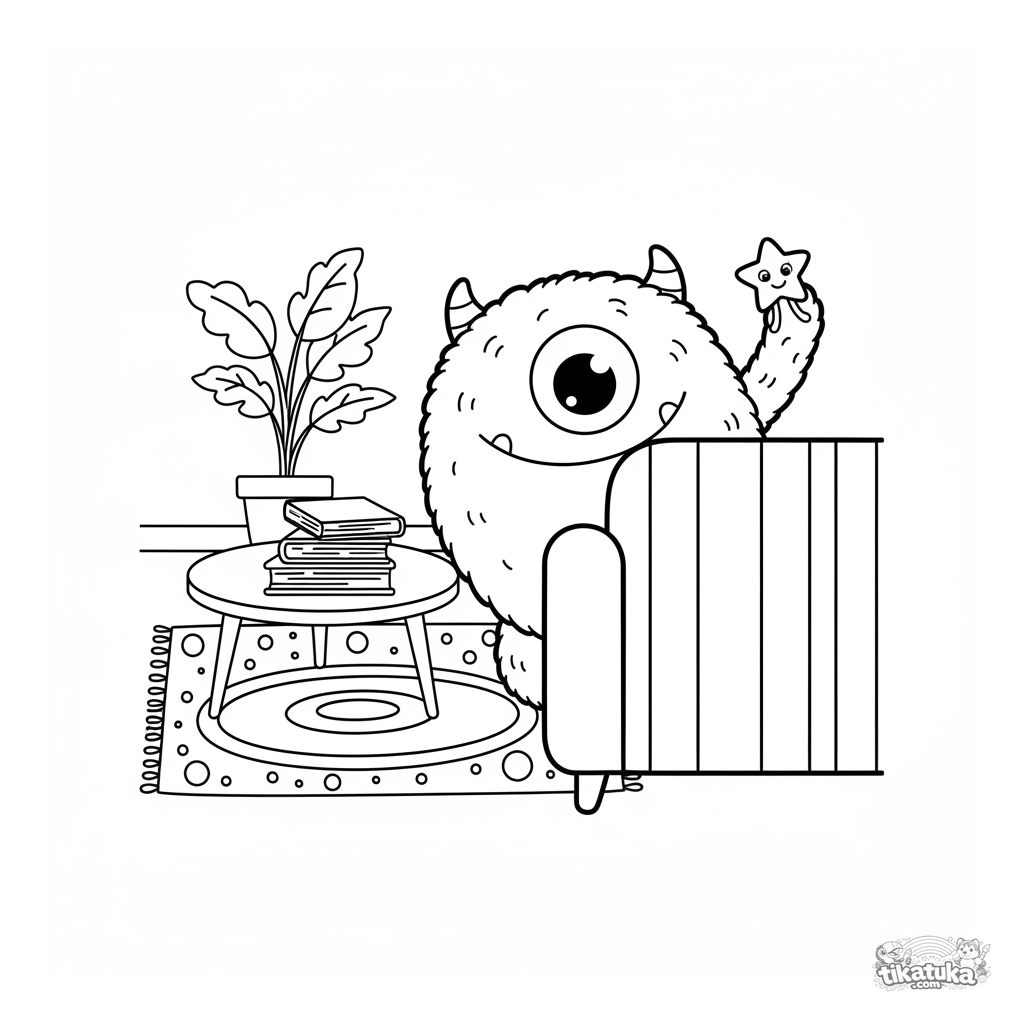 Página para colorir para crianças 4-6: um monstro peludo com um olho espiando atrás do sofá. Cena engraçada.
