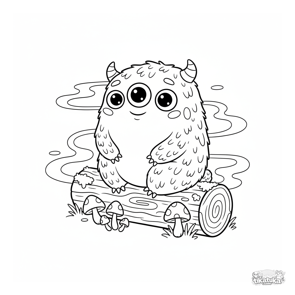 Página para colorir para crianças: um monstro coberto de musgo com três olhos sentado em um tronco na floresta nebulosa. Para 4-6 anos.