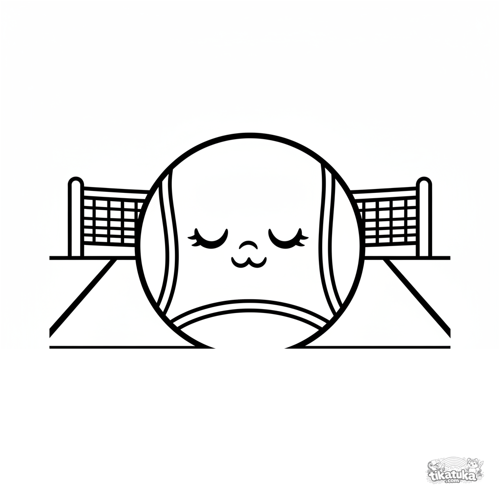 Página simples para colorir para bebês de 2-3 anos: uma grande bola de tênis de pelúcia com rosto descansando na linha da quadra.