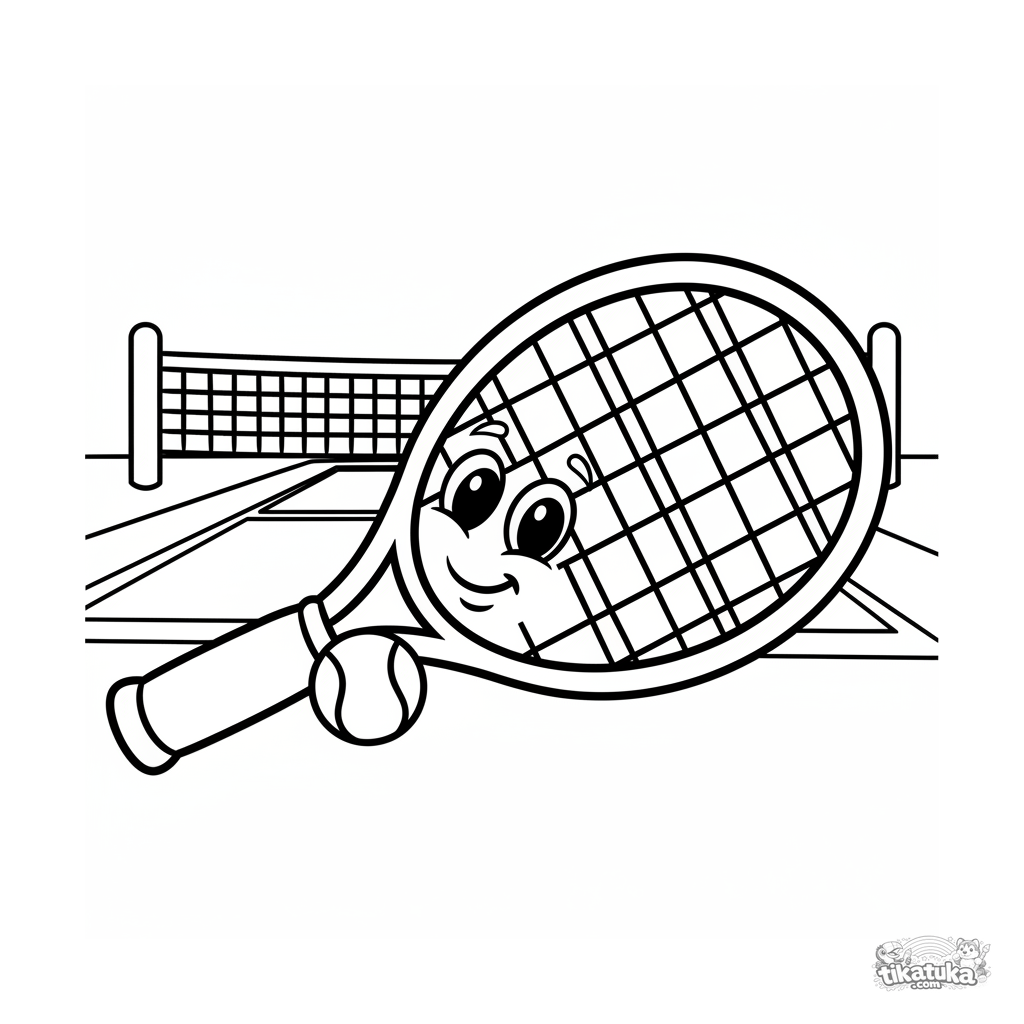 Página para colorir simples para crianças de 2-3 anos: uma grande raquete de tênis de pelúcia com rosto está em uma quadra. Formas grandes, margens amplas.