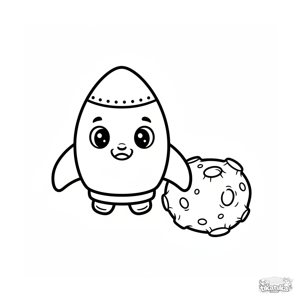 Página para colorir para crianças pequenas de 2-3 anos: um foguete fofo com olhos voa perto de um asteroide.