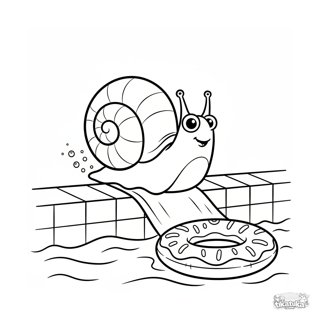 Página para colorir para crianças de 4-6 anos: um caracol feliz desce pela parede em direção a uma boia no fundo. Cena divertida, contornos claros, rosto fofo.