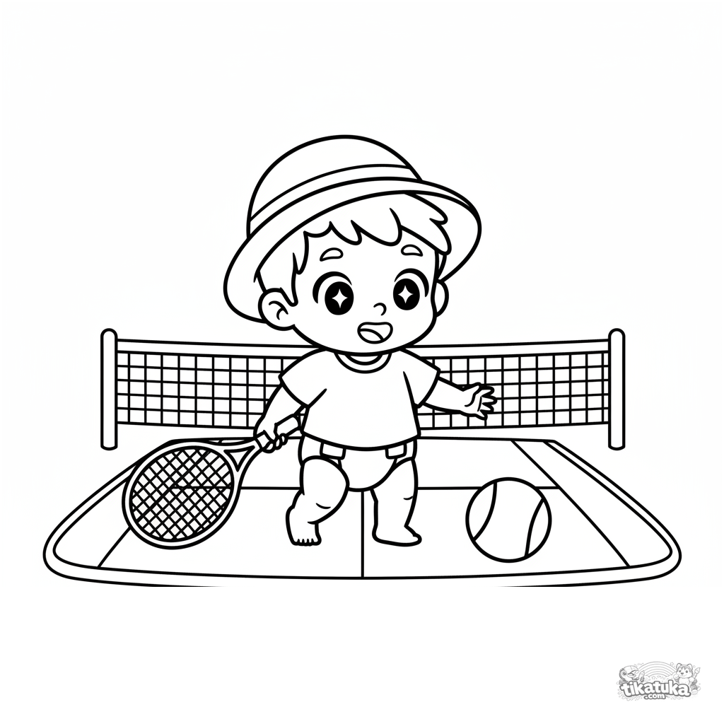 Página para colorir para bebês 2-3 anos: criança com raquete grande persegue bola na quadra de tênis. Formas grandes e simples.