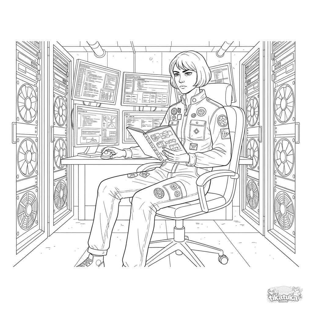 Página para colorir para 10-12 anos: um entusiasta de cibersegurança trabalhando em uma sala de servidores no porão. Racks de servidores detalhados, múltiplos monitores, ventiladores e diagramas.